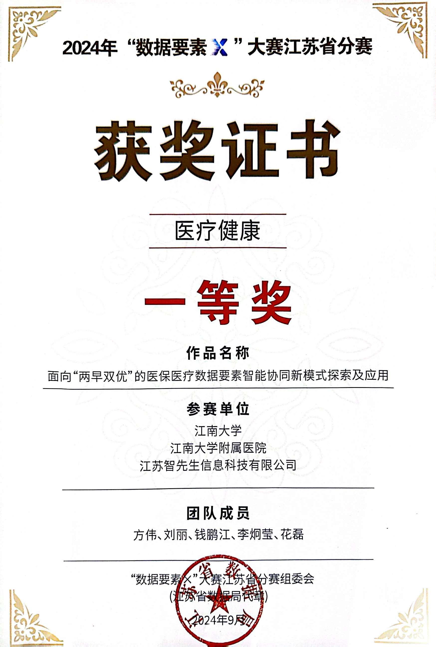 附属医院与江苏智先生信息科技有限公司联合组成的创新团队(简称江大创新团队,成员包括方伟、刘丽、钱鹏江、李炯莹、花磊等),在江苏省数据局举办的2024年“数据要素X”大赛江苏省分赛中以卓越的表现脱颖而出,荣获一等奖。江大创新团队提出的面向“两早双优”的医保医疗数据要素智能协同新模式,获得了评委们的高度认可和一致好评。