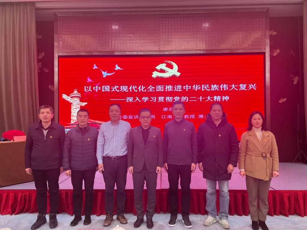 仪式由江苏广电无锡分公司的党员代表主持,共建单位的党支部书记首先进行了共建签约,通过建立联盟,五家党支部以期能共同赋能、取长补短,提升党建工作水平。唐忠宝教授以《以中国式现代化全面推进中华民族伟大复兴——学习贯彻党的二十大精神》为题开展讲座,他从党的二十大精神入手,谈到如何开辟马克思主义中国化时代化新境界,如何建立习近平新时代中国特色社会主义思想的世界观和方法论,何为中国式现代化的五个特征,以及中国式现代化的本质要求和全面建设社会主义国家的目标任务,提出我们要坚持党的全面领导和全面从严治党,应对风险挑战。唐教授旁征博引,语言风趣幽默,深入浅出的将党的二十大精神讲得明白透彻。