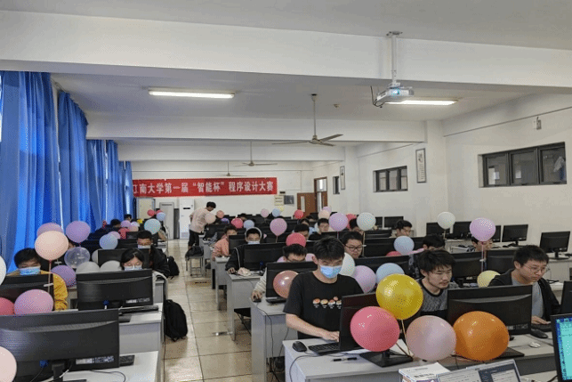 此次大赛于10月11日-14日发布大赛通知且开放报名通道,吸引了全校来自不同学院近300名同学报名参赛。大赛共分三个阶段:网络预选赛、热身赛及现场赛。经过网络预选赛后,有44名同学进入到最终的热身赛及现场赛。现场赛中每个题目对应一种颜色的气球,成功解答该题目的队伍会得到对应颜色气球。比赛现场竞争激烈,同学们争分夺秒,气球争相升起,经过长达5个小时的角逐,91porn