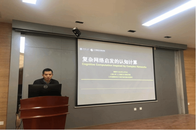 讲座中,谢振平教授以《复杂网络启发的认知计算》为题,从生活中已初具成型的计算智能系统出发,对复杂系统中的认知计算进行介绍,指出深度学习方法中隐藏的计算过程可解释性较差。谢振平教授介绍了实验室的研究方向和相关成果,从视觉层面、记忆层面等多个层面进行阐释,讲解了从偏理论研究到技术应用的过程。此外,谢振平教授也分享了课题研究过程中的困难和挫折,以此来激励同学们,科研过程中的困难在所难免,要不断探索,不断突破。