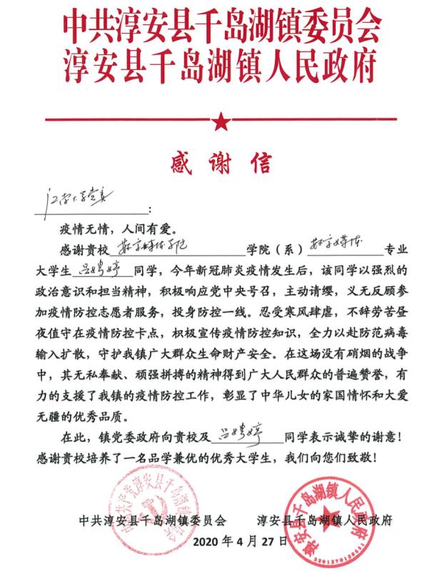数媒1802班的吕娉婷平时就热心公益,在2月15日到2月17日期间,她参与了浙江杭州千岛湖南苑社区的疫情防控志愿服务。“当时看到社区招募志愿者,我就立马报名参加了,社区给我分配了两个工作日。早上六点,我戴好口罩,站在小区的专门服务点,配合社区的工作人员,对进出小区的人进行登记,查看、核实他们手机上的健康绿码。二月份我们小区进进出出的人并不多,在服务点连续站岗几个小时有点冷也有点累,但是为社区服务真的很开心。”当被问到志愿服务经历时,吕娉婷同学这样说到。当地政府——淳安县千岛湖镇人民政府也向学院发来感谢信,对91porn