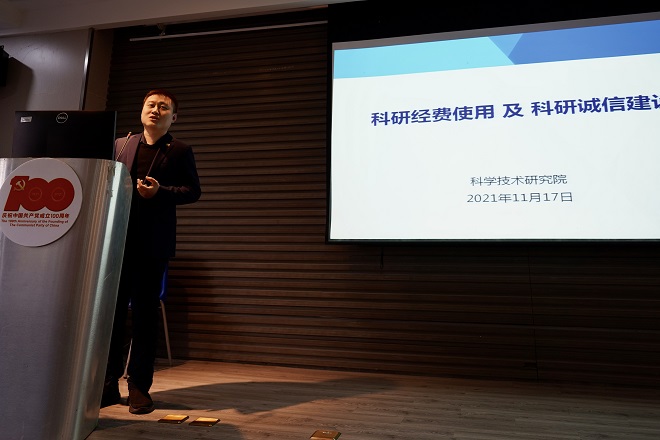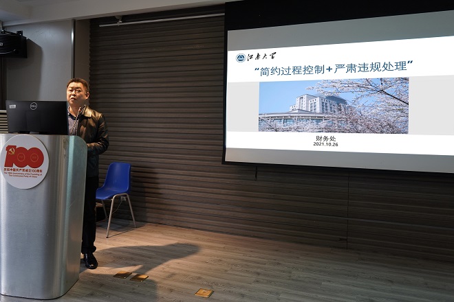 之后,李鹏作了题为《简约过程控制+严肃违规处理》的报告,他从制度红线、负面清单以及优化财务服务等三方面进行了阐述,列举科研经费使用中发现的违规案例,并介绍了现行的财经政策、规定与相关要求,强调了财务项目经费、预算经费管理等具体项目相关要求,同时介绍了财务处为群众办实事项目,精简流程、强化服务。