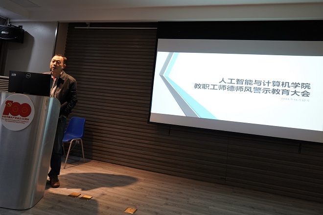 2021年11月17日下午,学院在智能楼116报告厅举行教职工大会,科研院院长范大明、财务处副处长李鹏、纪委监督检查室主任魏静受邀参加大会并作专题培训,院长刘渊作师德师风警示教育,会议由党委书记张华主持。
