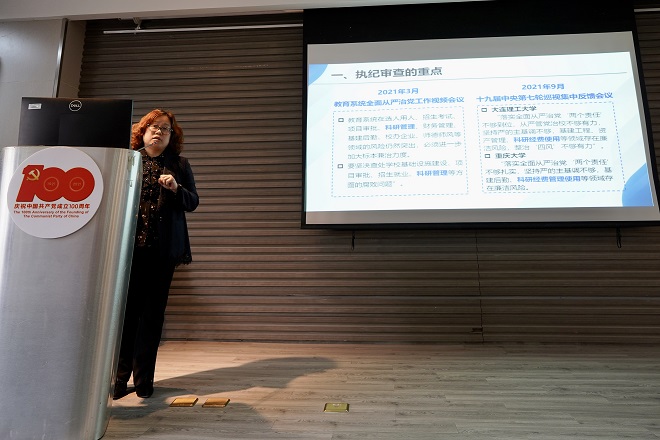 首先,魏静作了题为《科研经费违规使用的纪法分析》的专题培训,她从执纪审查的重点、执纪审查的发现以及违纪行为的处理这三方面讲述了在科研经费使用中需要关注的重要问题,强调了要在纪法之下想问题、作决策、办事情,确保科研经费依规依纪依法使用,助力科研工作高质量发展。