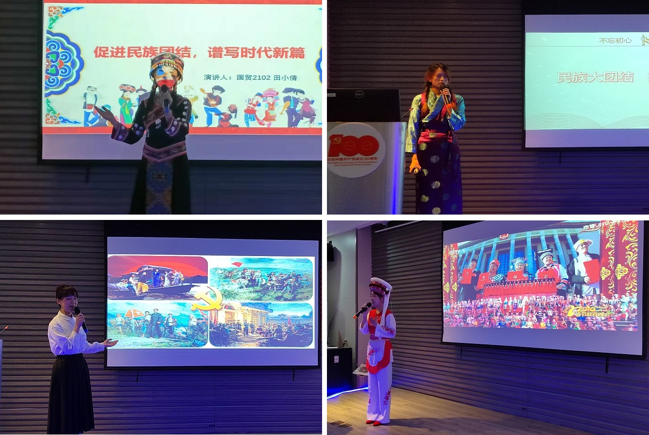 在主持人对比赛评委、比赛流程及比赛规则进行了介绍后,本次比赛正式开始。来自汉族、维吾尔族、藏族、蒙古族、哈萨克族、白族、土家族等10名晋级决赛的少数民族同学身着民族服饰,围绕“民族团结一家亲,同心共筑中国梦”的主题,弘扬民族团结,铸牢中华民族共同体意识,加强各民族交往交流交融,促进各民族像石榴籽一样紧紧抱在一起,将共同团结奋斗、共同繁荣发展的精神,结合自身经历和身边的故事展现给了现场的每一个人,选手们各显神通、寓情于声、风格各异,彰显了当代大学生积极向上的精神风貌。精彩的演讲不断博得台下同学们的掌声和喝彩声,现场气氛十分活跃。评委们分别从主题内容、语言表达、即兴演讲和综合印象等方面为选手们进行了打分。经过激烈的角逐,最终来自商学院国贸2103班木阳同学荣获一等奖,她赛后激动的表示:“我们是党百年目标的见证者,也是国百年目标的亲历者,生逢最好的时代,我们怎能自甘落寞?欲知大道,必先知史。这次比赛是思想的碰撞和交流,它更是我们共同向历史寻经验、求思路、找方法,读懂百年党史的精神内涵的有效途径。”