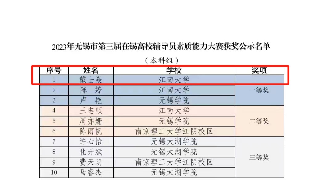 5月13日,由无锡市教育局主办,无锡市职业院校思想政治教育联盟、无锡城市职业技术学院、无锡市职业技术教育学会德育工作委员会承办的无锡市第三届在锡高校辅导员素质能力大赛在中国企业管理无锡培训中心成功举办。来自全市16所高校的32位辅导员同台竞技、各展风采,大赛对选手的理论水平、专业素养以及解决实际问题的能力进行了多角度的考察。经过激烈角逐,我院辅导员戴士焱荣获本科组一等奖,充分展示了我院辅导员良好职业素养和精神风貌。