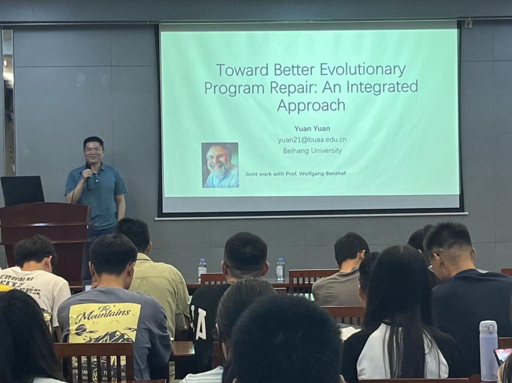 北京航空航天大学袁源教授的报告主题是《Toward Better Evolutionary Program Repair: An Integrated Approach》,他介绍了团队最近的工作ARJA,一个针对Java的新型进化软件故障修复系统,旨在解决程序修复中的搜索空间、搜索算法和修补程序排序方面的挑战。并通过展示ARJA在224个真实的Java故障上的评估结果,体现出其在比较多种先进修复技术方面的优越性。