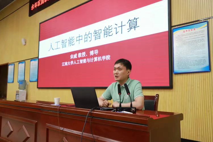 副院长、教授、博导宋威应邀为永年区第二中学的近300名师生作《人工智能中的智能计算》主旨报告。宋威从关注度较高的"Chat GPT"为导引,详细介绍了Chat GPT的运行机理和相关产业发展,并阐述了深度学习的原理。报告中,宋威以图灵测试为切入点,从人工智能改变生活的案例,系统介绍了神经网络、遗传算法、神威太湖之光超级计算机等技术,深入浅出地让学生理解了人工智能中的智能计算。