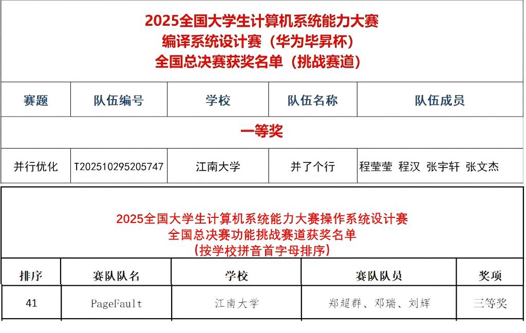 近日,2025全国大学生计算机系统能力大赛全国总决赛在华中科技大学举行。我院由方伟、周浩杰等担任指导老师的2支参赛队伍从清华大学、剑桥大学、北京大学等国内外顶尖高校的千余支队伍中脱颖而出,一举斩获编译系统挑战赛一等奖1项及操作系统功能挑战赛道三等奖1项,刷新我院在该项赛事中的历史最佳战绩。全国大学生计算机系统能力大赛是国内计算机领域极具影响力和权威性的赛事之一,着重考察大学生在计算机系统设计、开发与优化等方面的综合能力。在编译系统挑战赛中,CodeSize赛道的团队基于毕昇编译器,采用了BOLT、段节管理、压缩壳等技术,成功将代码体积平均降低了81.7%,远超去年的46.3%;并行优化赛道的团队扩展SysY语言,实现非规范循环结构向量化、并行块合并优化,并创新性利用AI驱动的自动化配置,实现指令级和线程级并行,显著提升程序性能。两支队伍均获得华为毕昇编译器架构师及编译器领域技术专家的高度评价。在操作系统功能挑战赛道中,参赛团队基于Linux内核模块编程技术,通过引入两级密钥架构、TPM密钥管理等创新性设计,实现了一个面向RISC-V架构的文件级安全文件系统,展示了团队在操作系统领域的深厚功底。